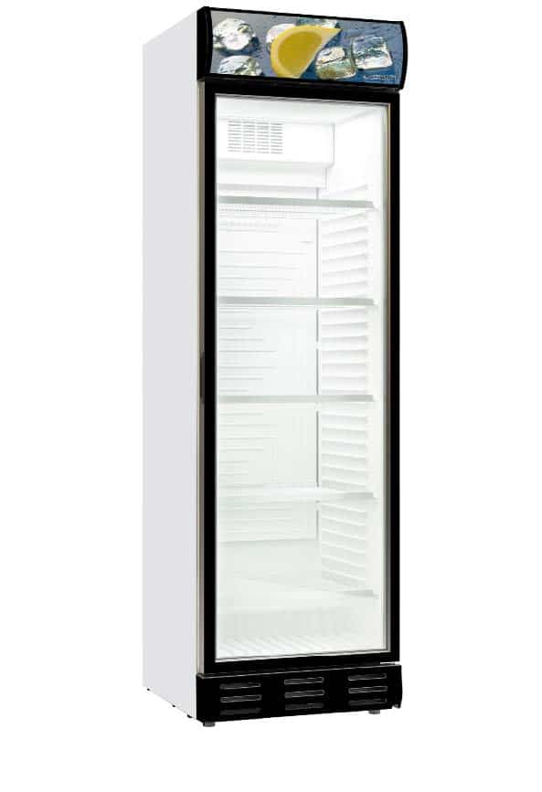 Vitrine à boissons 1 porte vitrée. Dimensions extérieures : 600x590x2000mm. Réfrigération ventilée : +4/+10°C. 6 niveaux de stockage / 5 grilles. Fermeture à clé. Bandeau lumineux 10 W sur le dessus. Dégivrage automatique. Fluide réfrigérant : R600A.